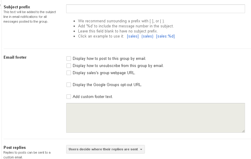 Some of these settings include an email subject prefix (such as ‘[MyGroup']), custom footer text that’s placed in the bottom of every email sent to the members of the group and various pieces of text (instructions on how to post and how to unsubscribe, a link to the group’s web page, etc.). Settings also include where message replies should be sent (e.g., to the entire group, to the author of the message being replied to, to the managers of the group, or allow the response author to choose), maximum message size, and whether or not to send bounce notifications to message authors.