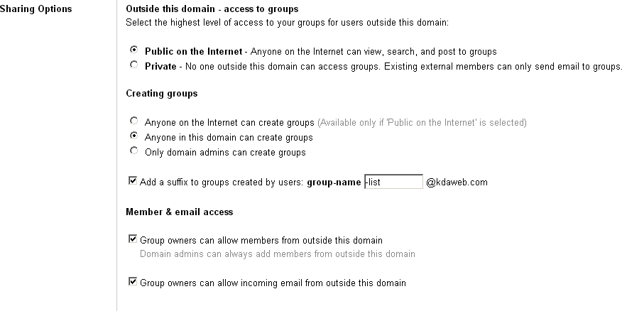 | Google Groups Settings from the Google Apps Domain Control Panel |